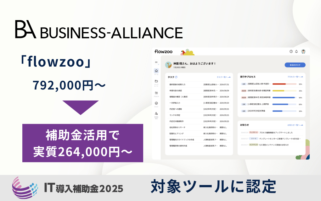 この度、新たにG&Nコンソーシアム構成員であるBUSINESS-ALLIANCE株式会社が提供する業務管理ツール「flowzoo」が、「IT導入補助金2025」の対象ツールとして登録されました。