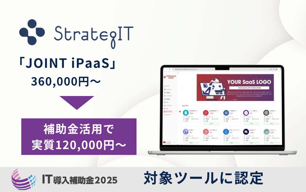 この度、新たにG&Nコンソーシアム構成員である株式会社ストラテジットが提供するシステム間のデータ連携効率化プラットフォーム「JOINT iPaaS」が、「IT導入補助金2025」の対象ツールとして登録されました。